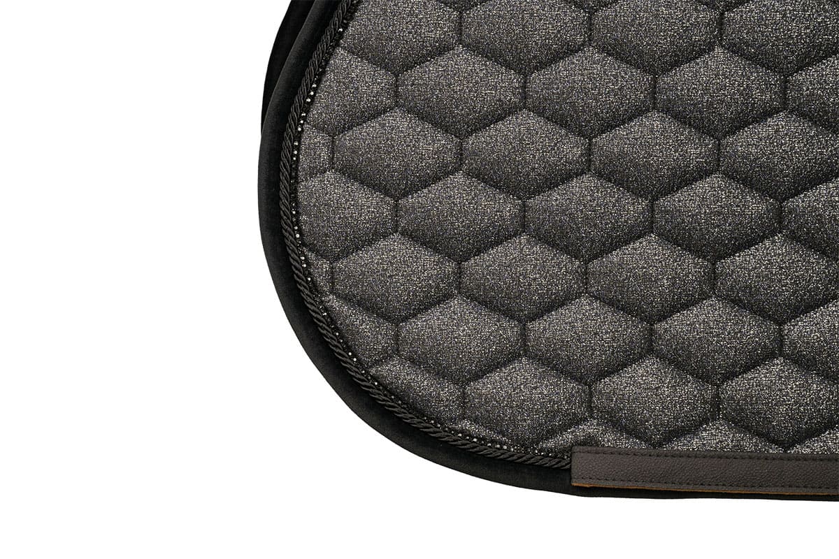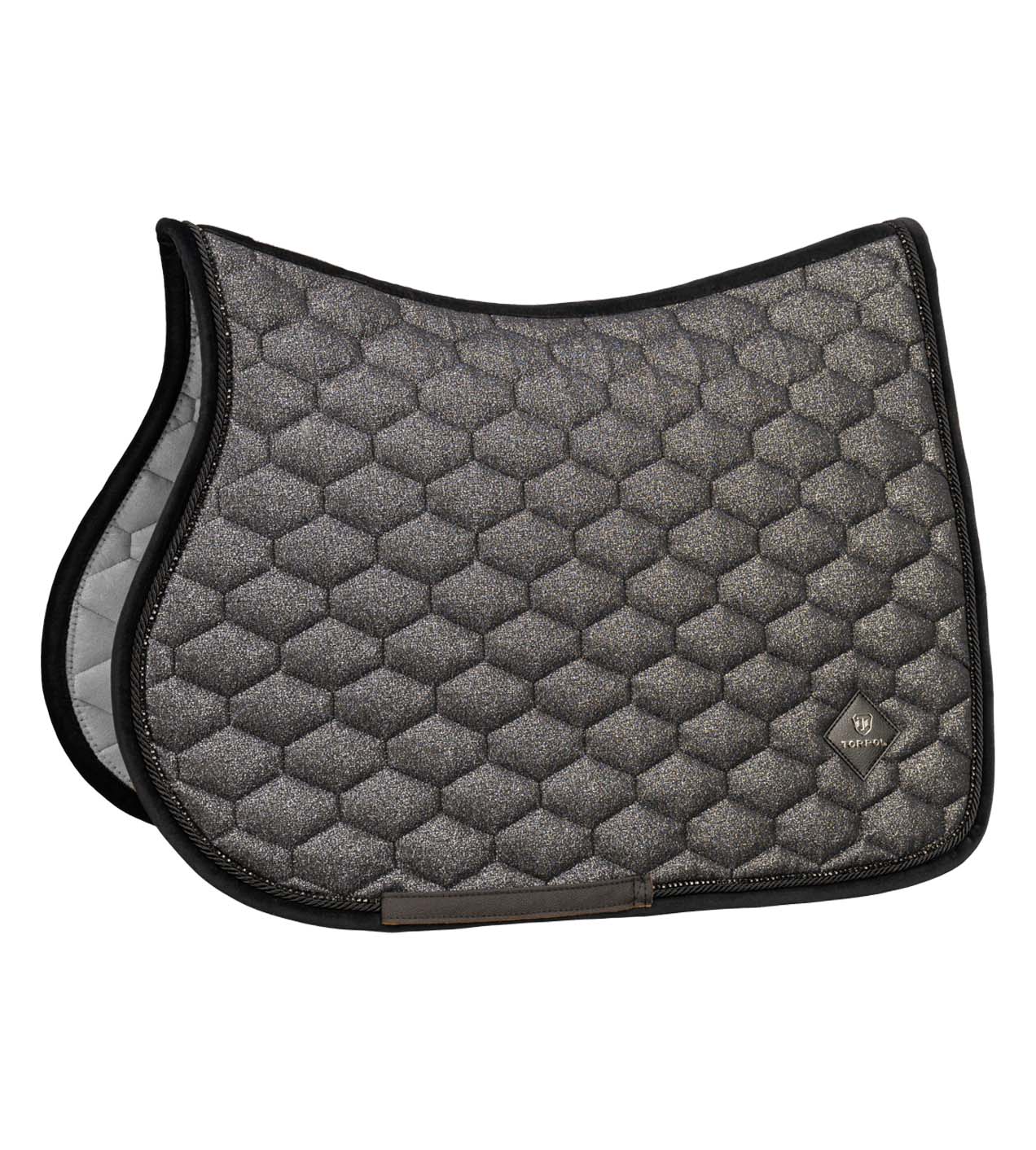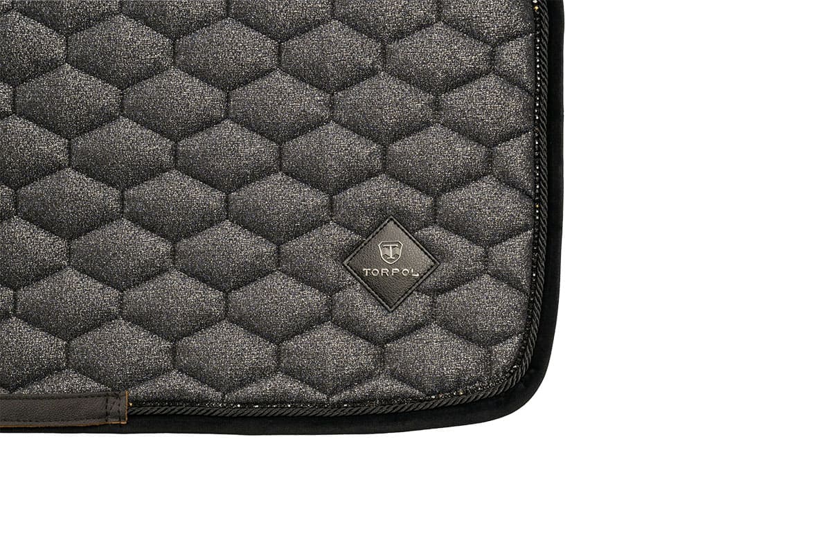 Miękki, przyjemny w dotyku z subtelnym srebrno-brokatowym błyskiem. Wykończony welwetową lamówką, ozdobiony czarnym sznurem i kryształkami oraz obustronnym metalicznym emblematem Torpol. Doskonale prezentuje się zarówno w świetle reflektorów, jak i w promieniach słońca. Idealnie dopasowany do grzbietu konia.