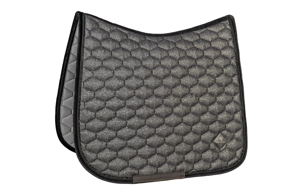 Czaprak Shiny Miękki, przyjemny w dotyku z subtelnym srebrno-brokatowym błyskiem. Wykończony welwetową lamówką, ozdobiony czarnym sznurem i kryształkami oraz obustronnym metalicznym emblematem Torpol. Doskonale prezentuje się zarówno w świetle reflektorów, jak i w promieniach słońca. Idealnie dopas…