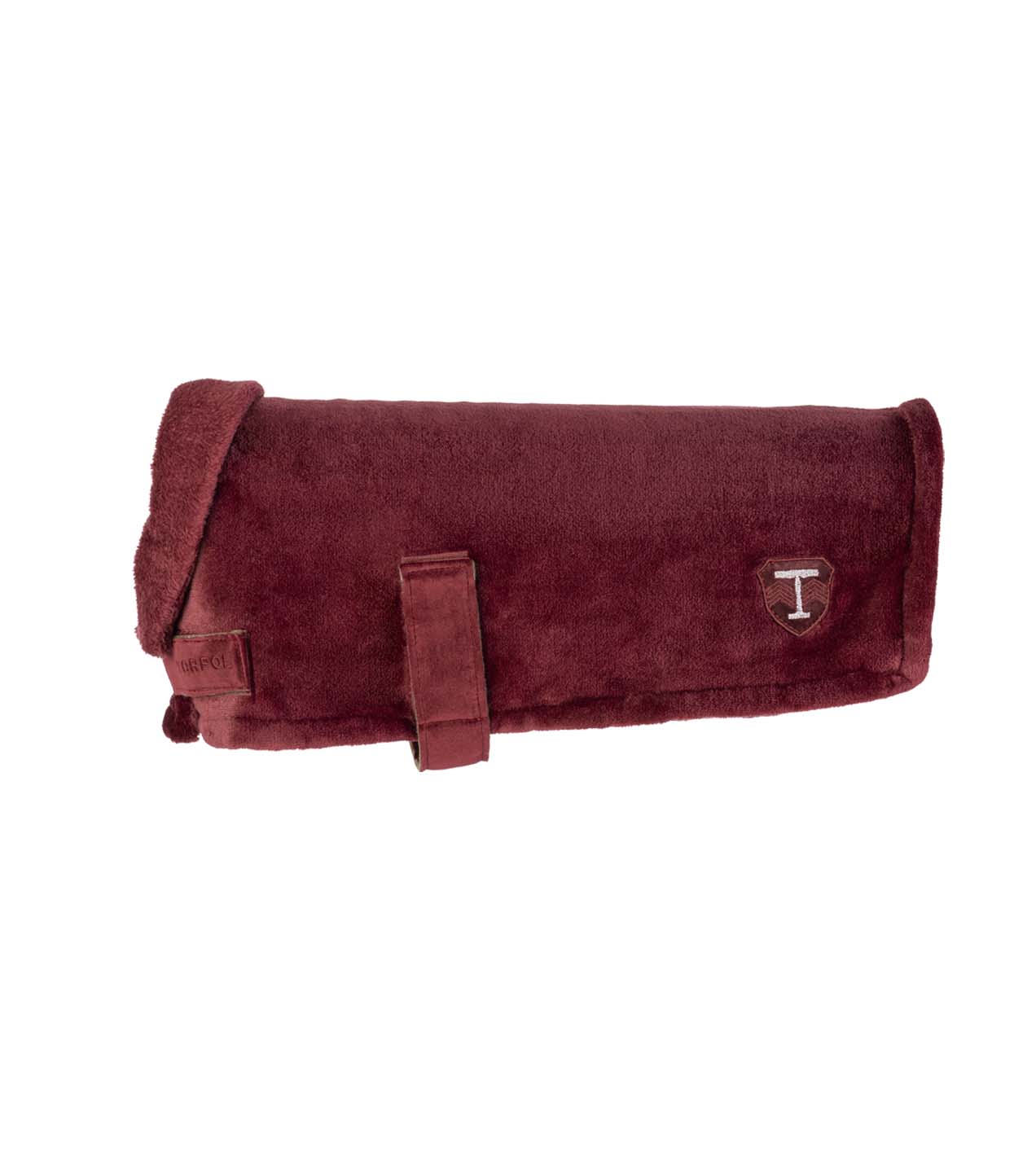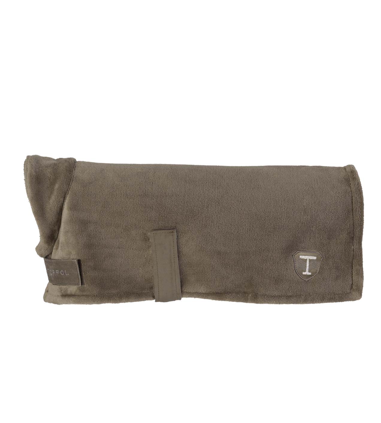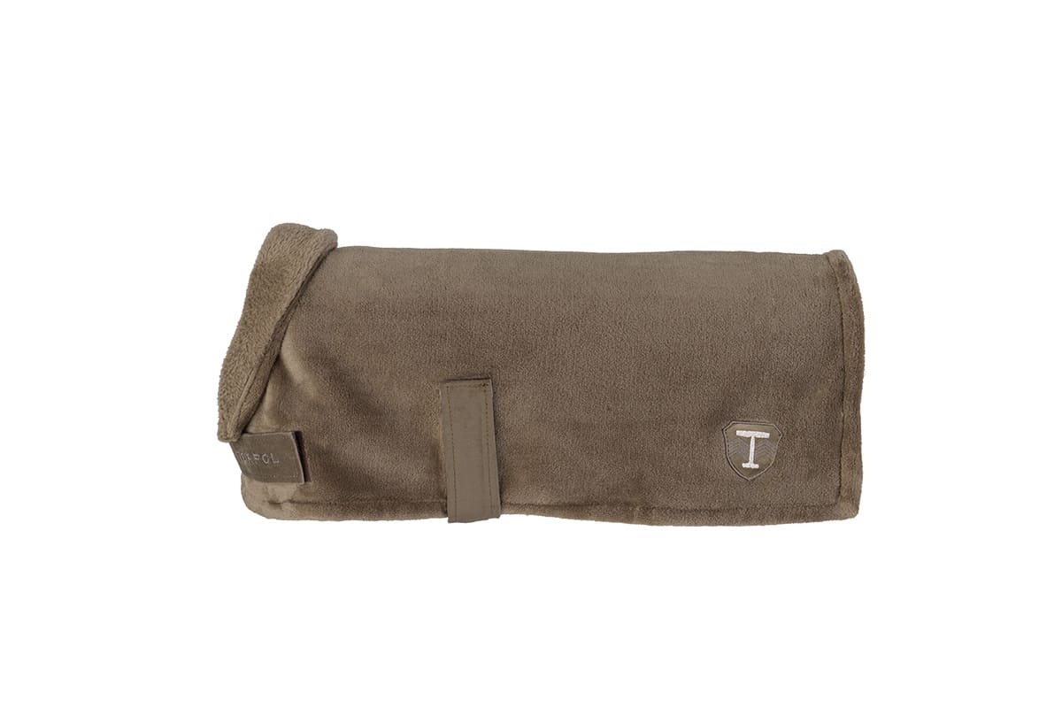 Komfortowa, wykonana z miękkiej dzianiny pluszowej. Ozdobiona metalicznymi haftami. Wspaniale układa się na grzbiecie, a odwijany kołnierz nadaje jej wyjątkowy charakter i chroni szyję przed chłodem. Świetnie odprowadza pot. Zapewnia optymalną termoregulację i cyrkulację powietrza. Zapinana na rzep. Gumowe paski pod nogi utrzymują ją na właściwym miejscu.
