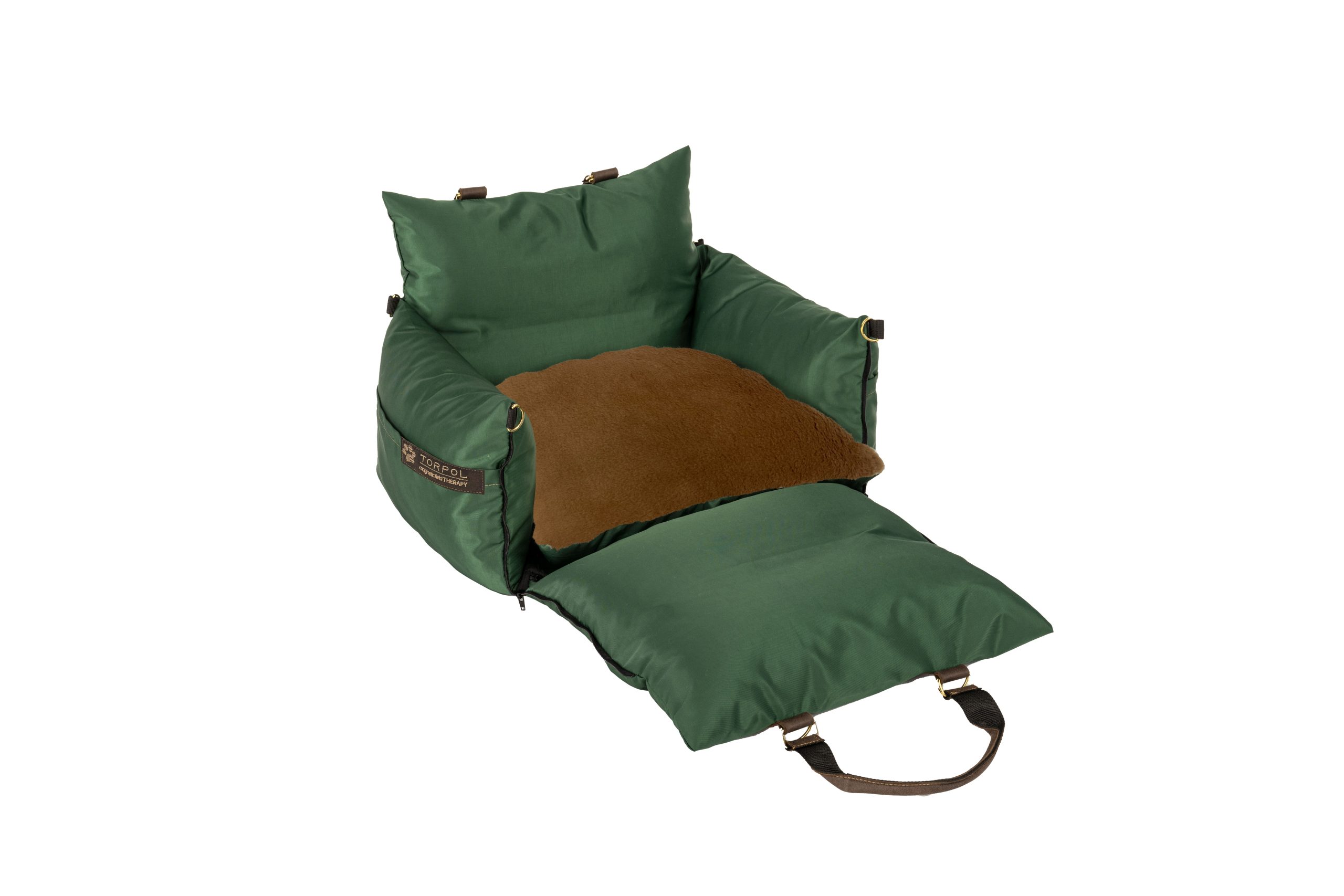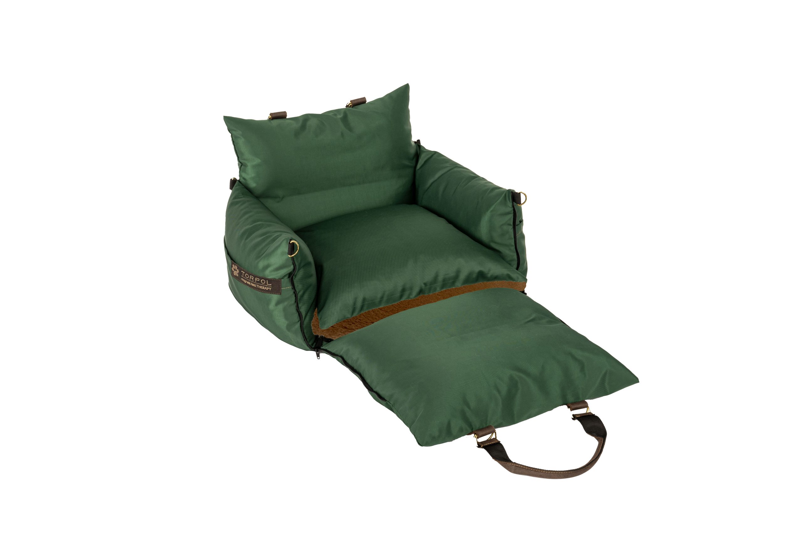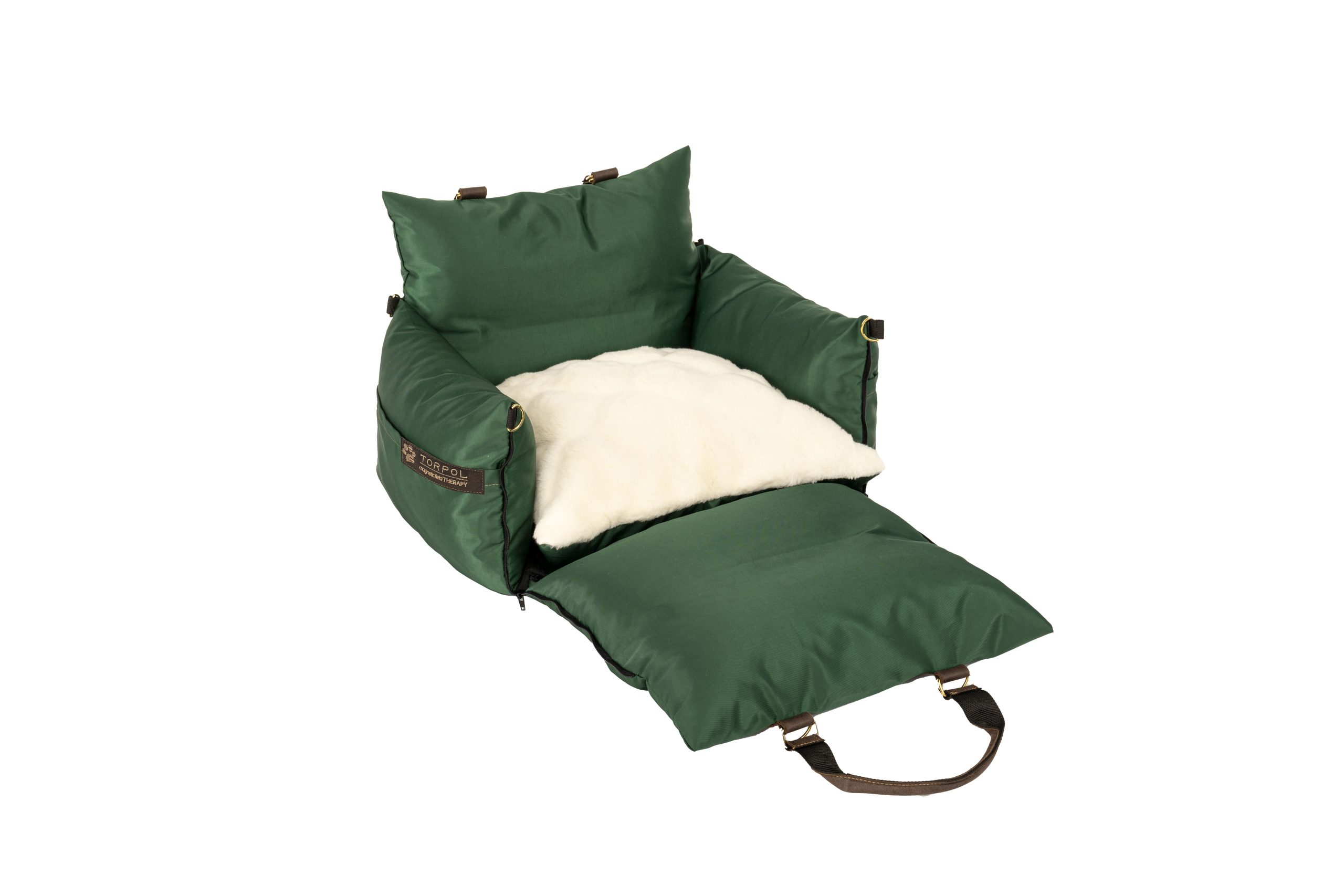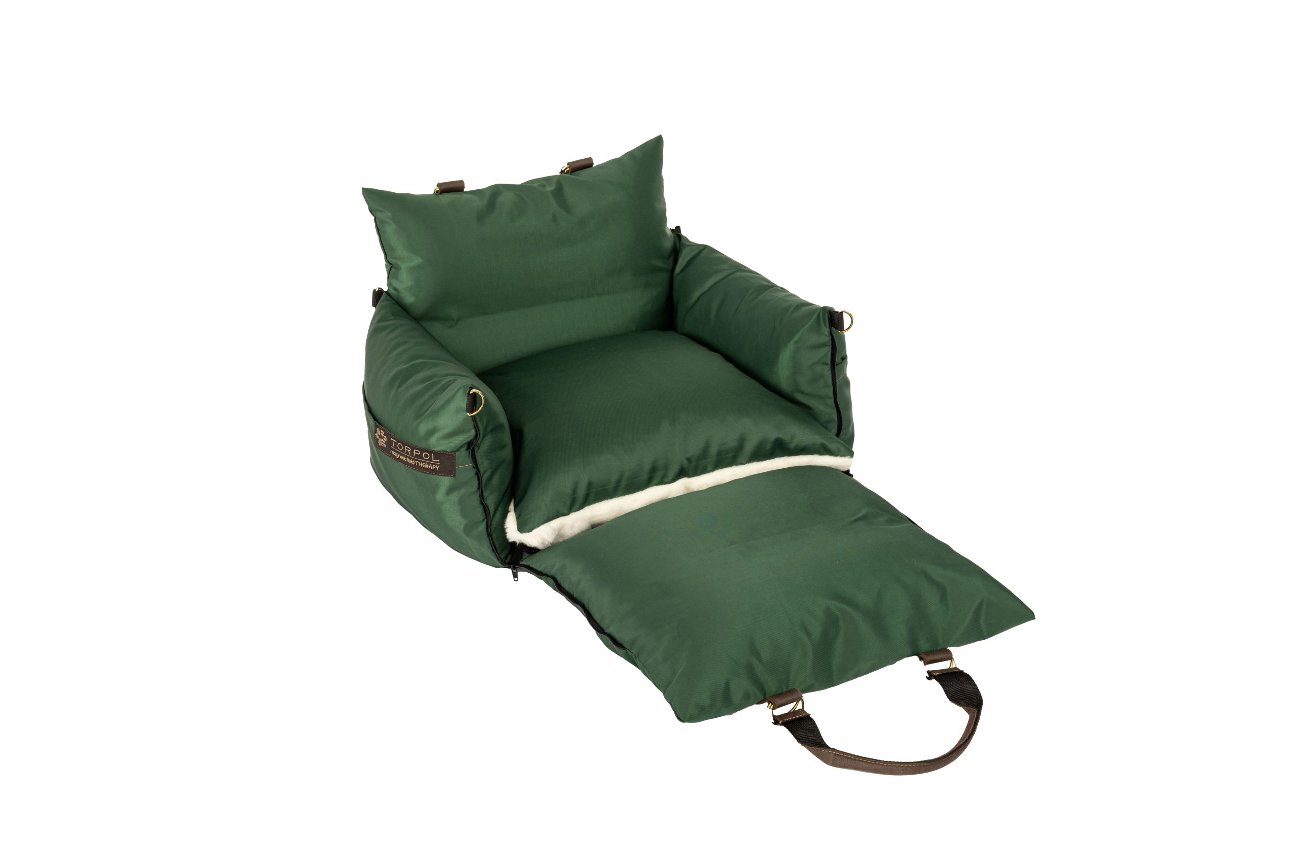 Torba posiada grube, miękkie boki. Przedni bok, wyposażony w zamki, po rozpięciu i rozłożeniu na płasko tworzy dodatkową powierzchnię posłania. Wewnątrz torby znajduje się komfortowa poduszka.