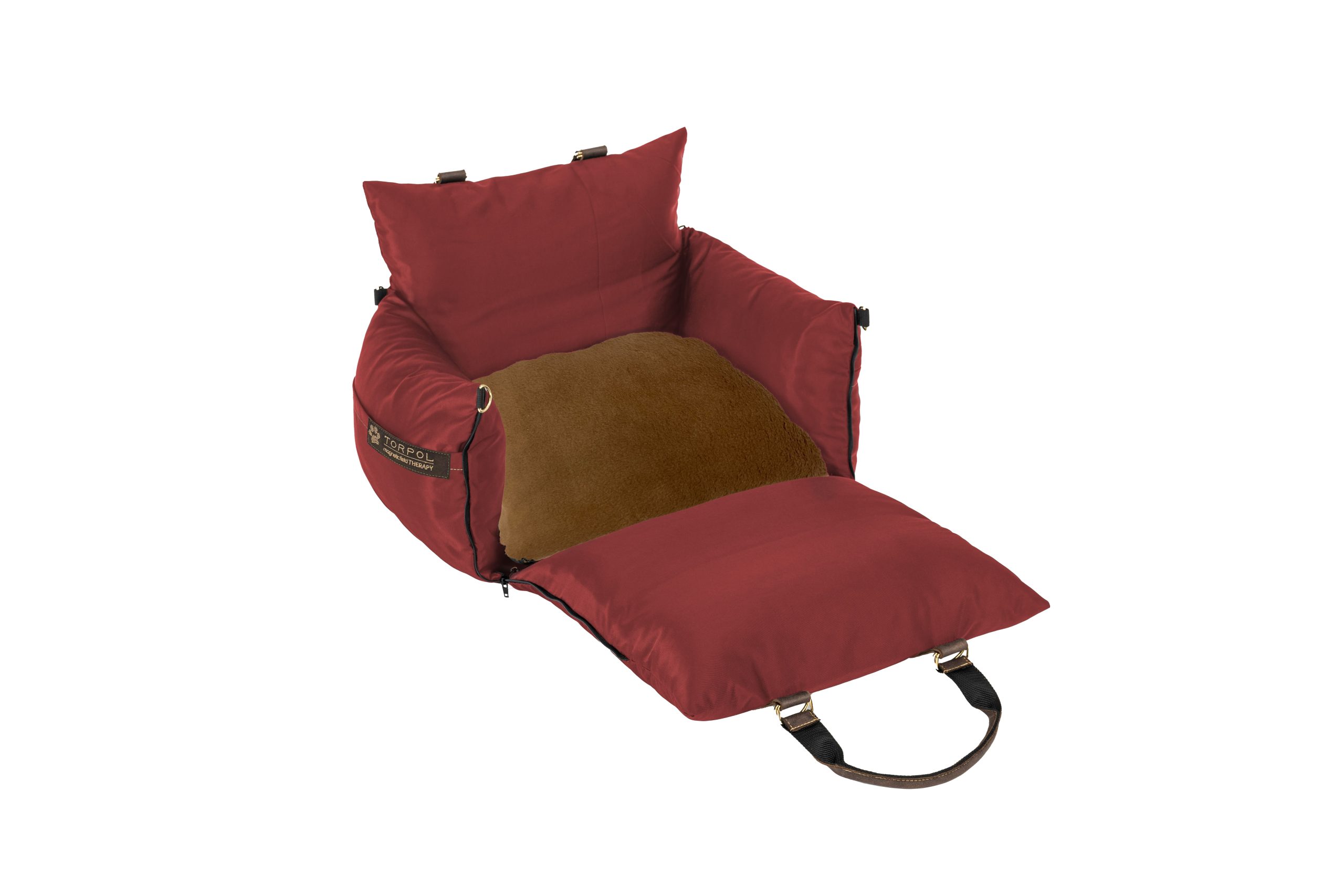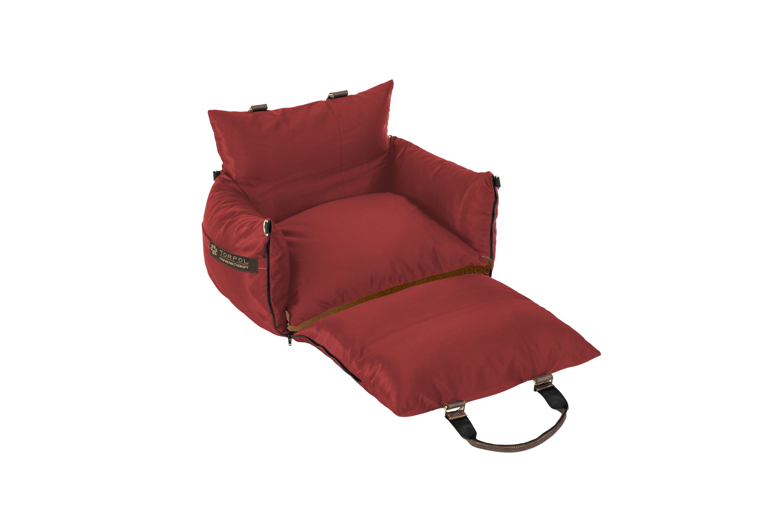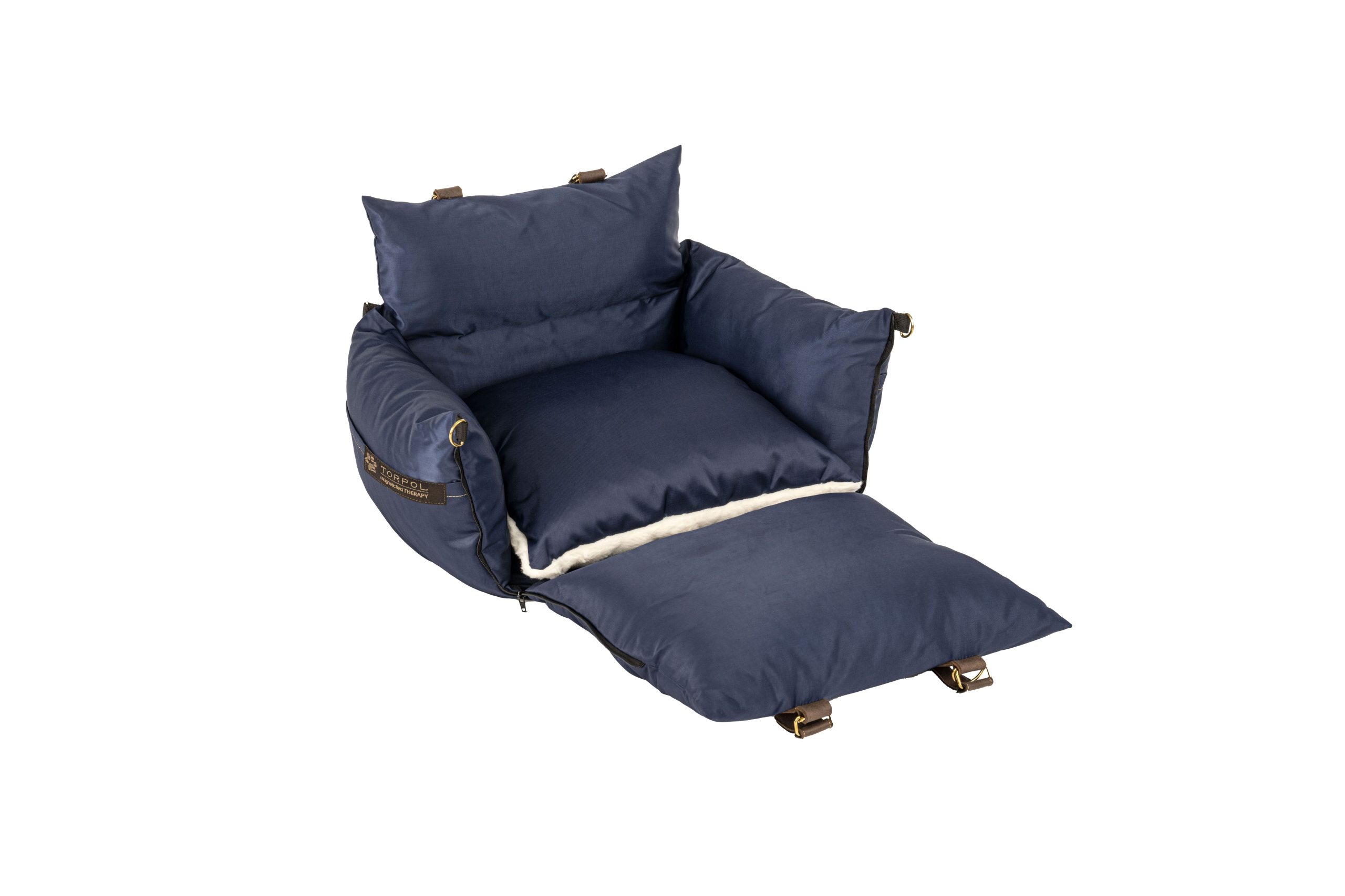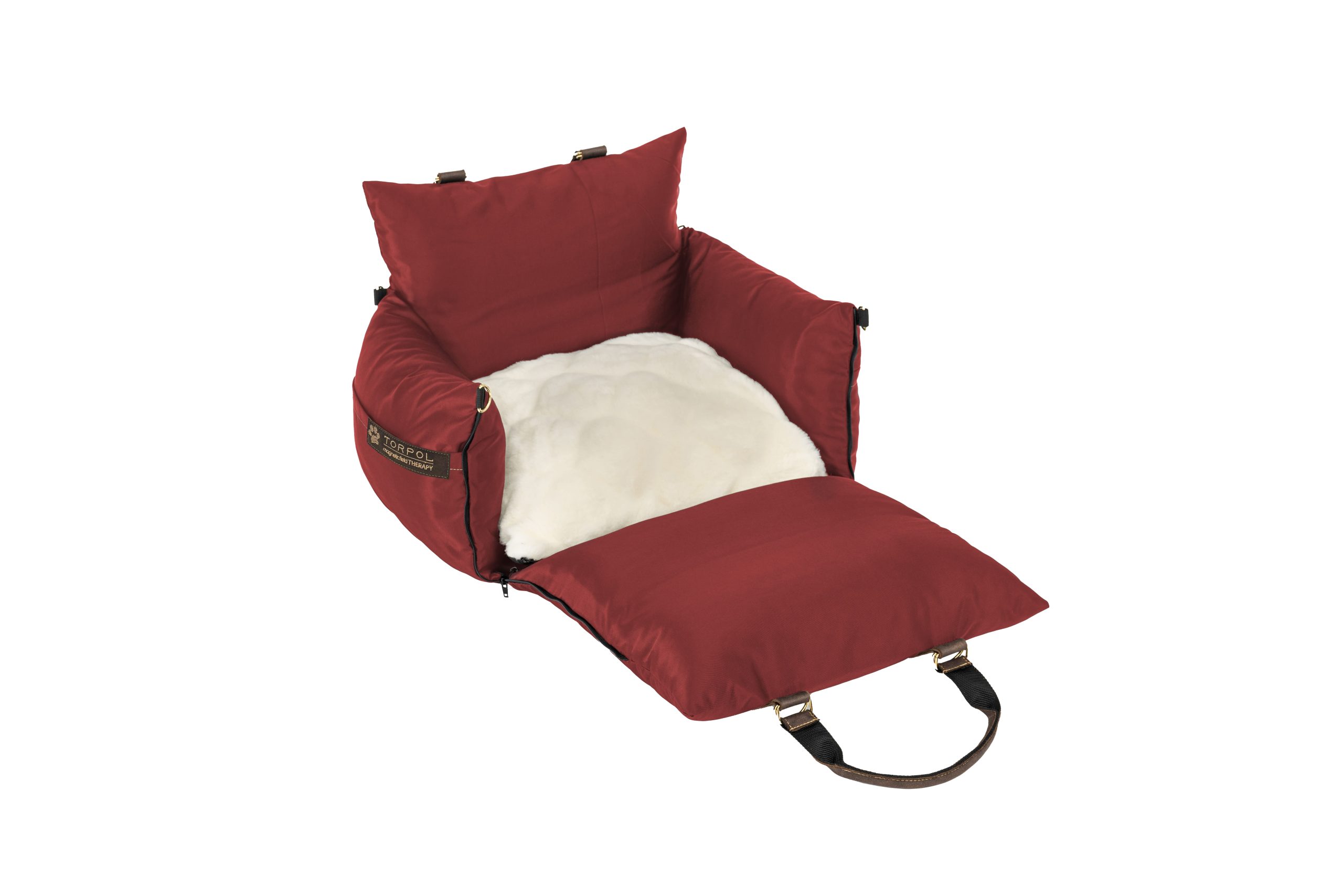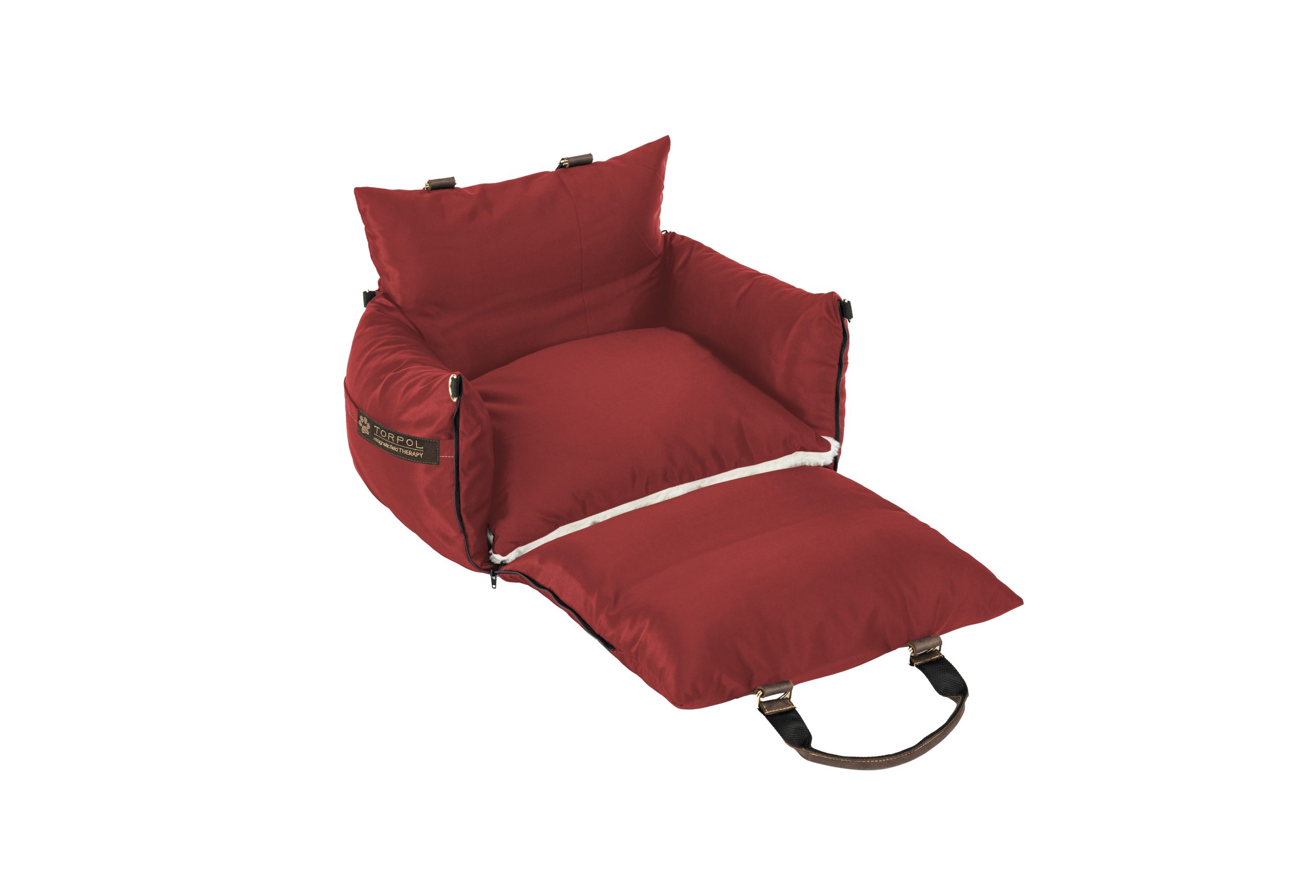 Torba posiada grube, miękkie boki. Przedni bok, wyposażony w zamki, po rozpięciu i rozłożeniu na płasko tworzy dodatkową powierzchnię posłania. Wewnątrz torby znajduje się komfortowa poduszka.